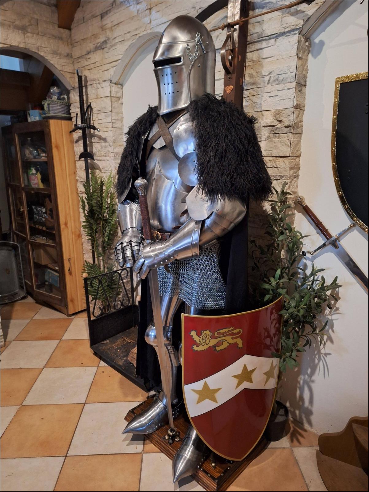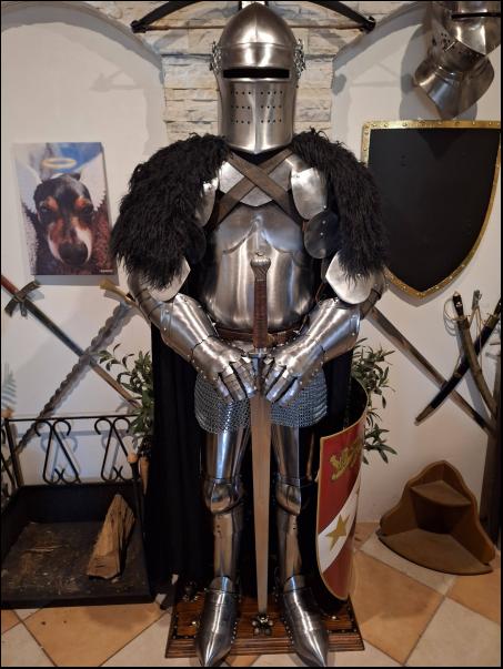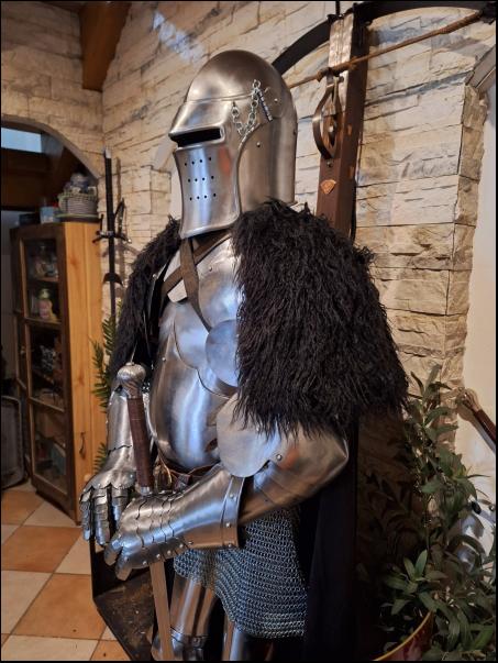 Cena: 3900,- Kč 4 dílný kyrys, plech o síle 1,2 mm, zapínání na kožené řemínky s přezkami. Větší velikost. Kyrys je nový, 1 x použitý, bez poškození. | |