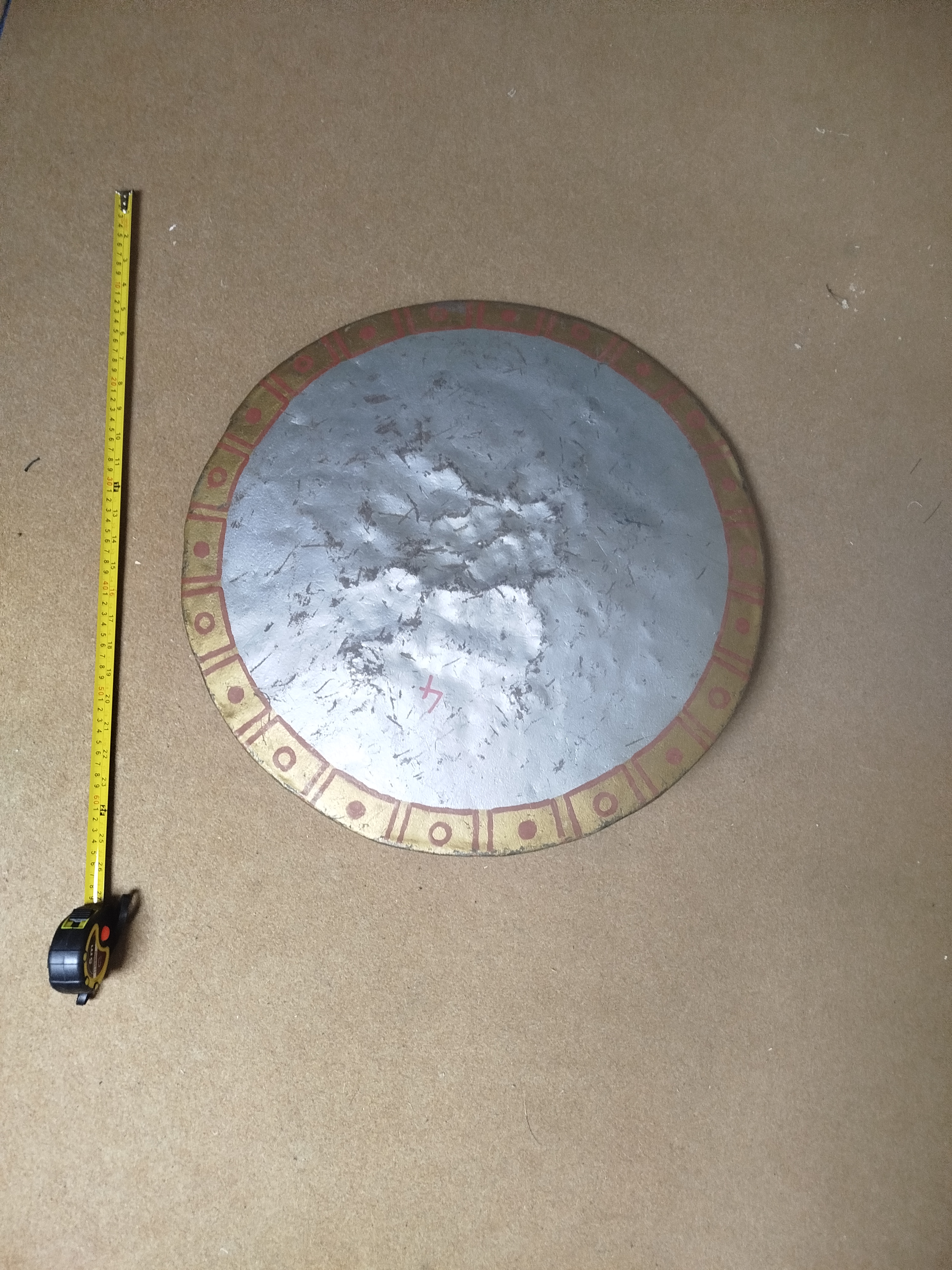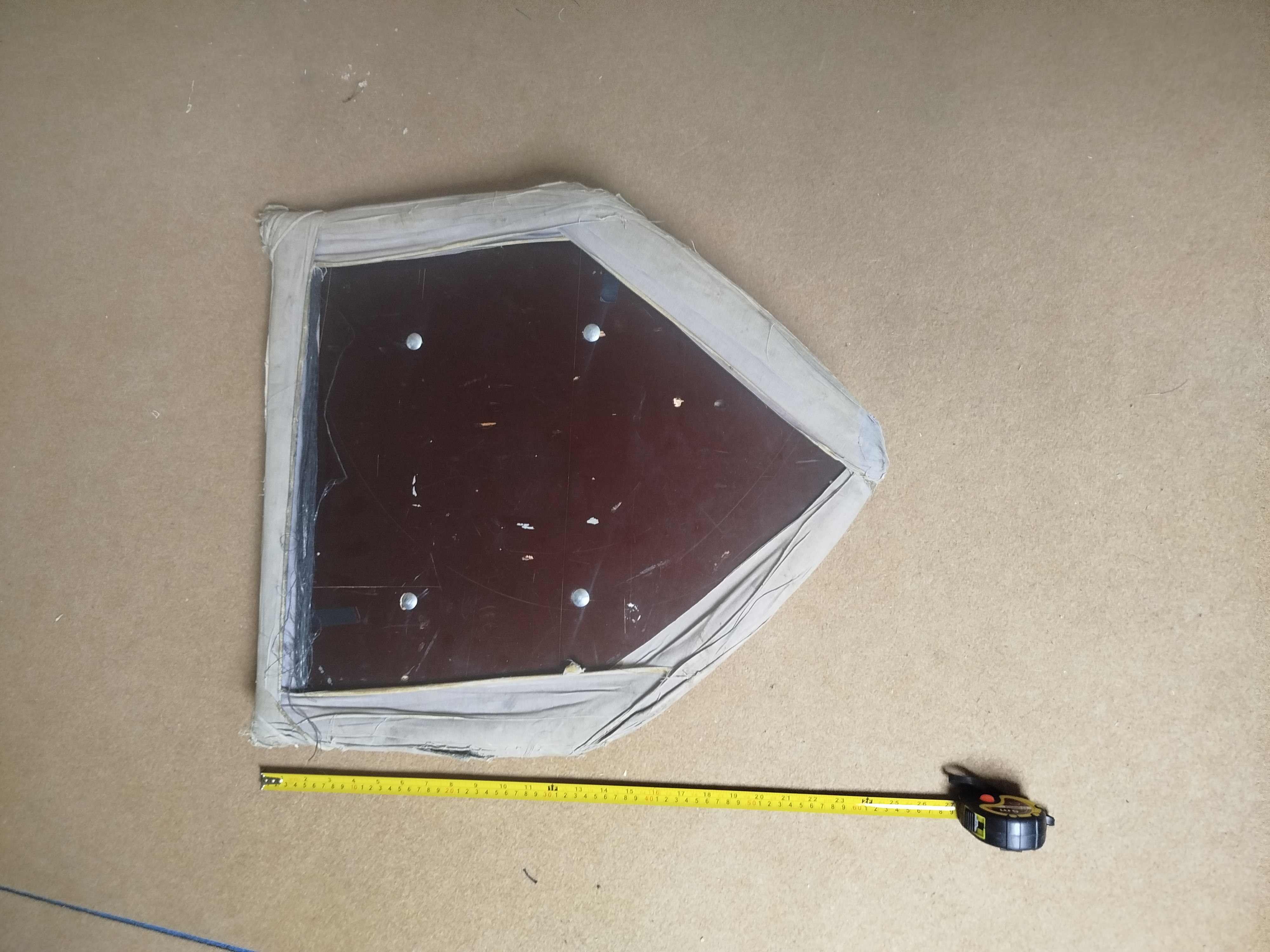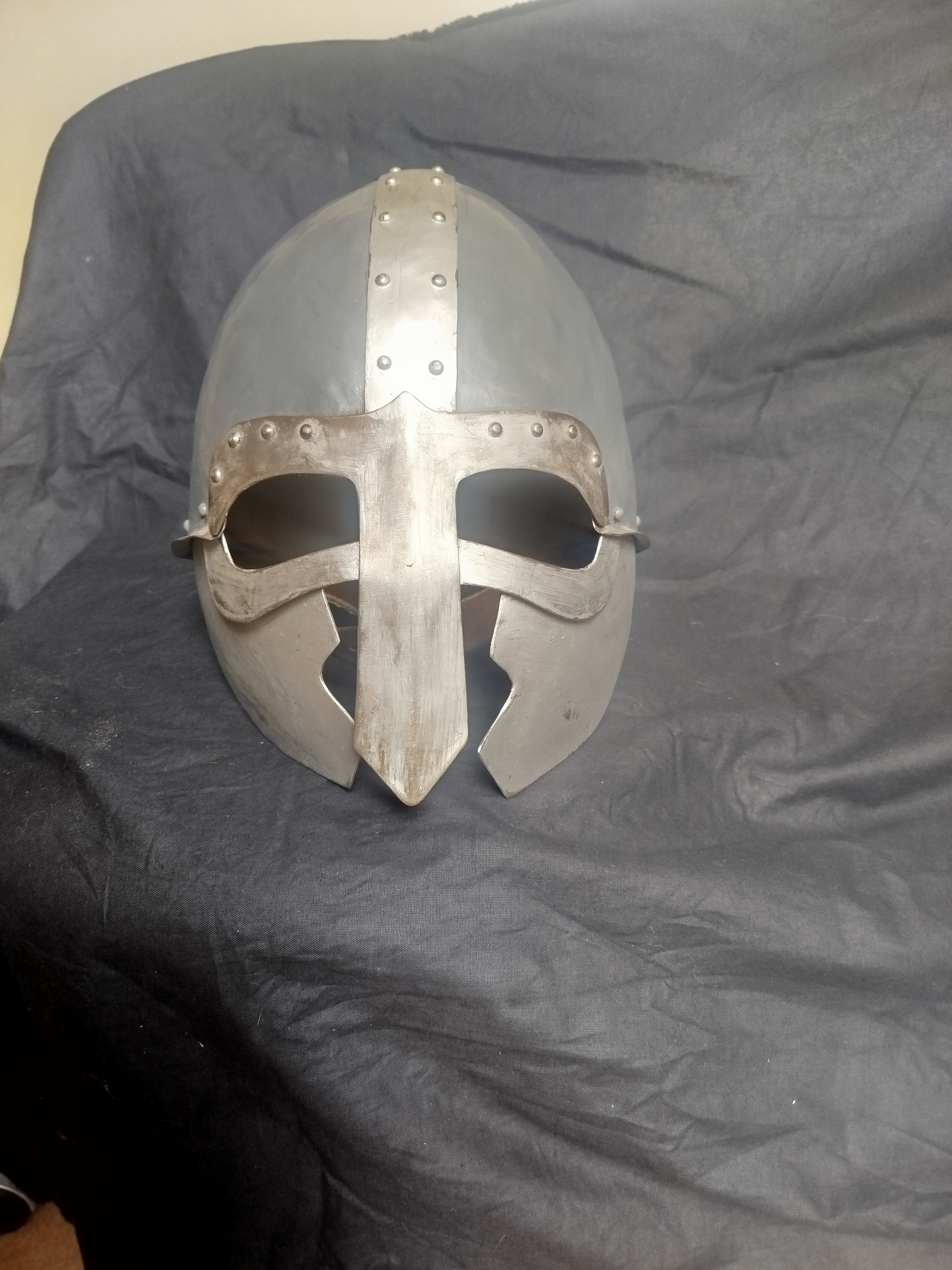 Přílba - sedí na hlavě s obvodem 58 cm, uvnitř výstel z molitanu, materiál 1 mm plech. (500 kč).