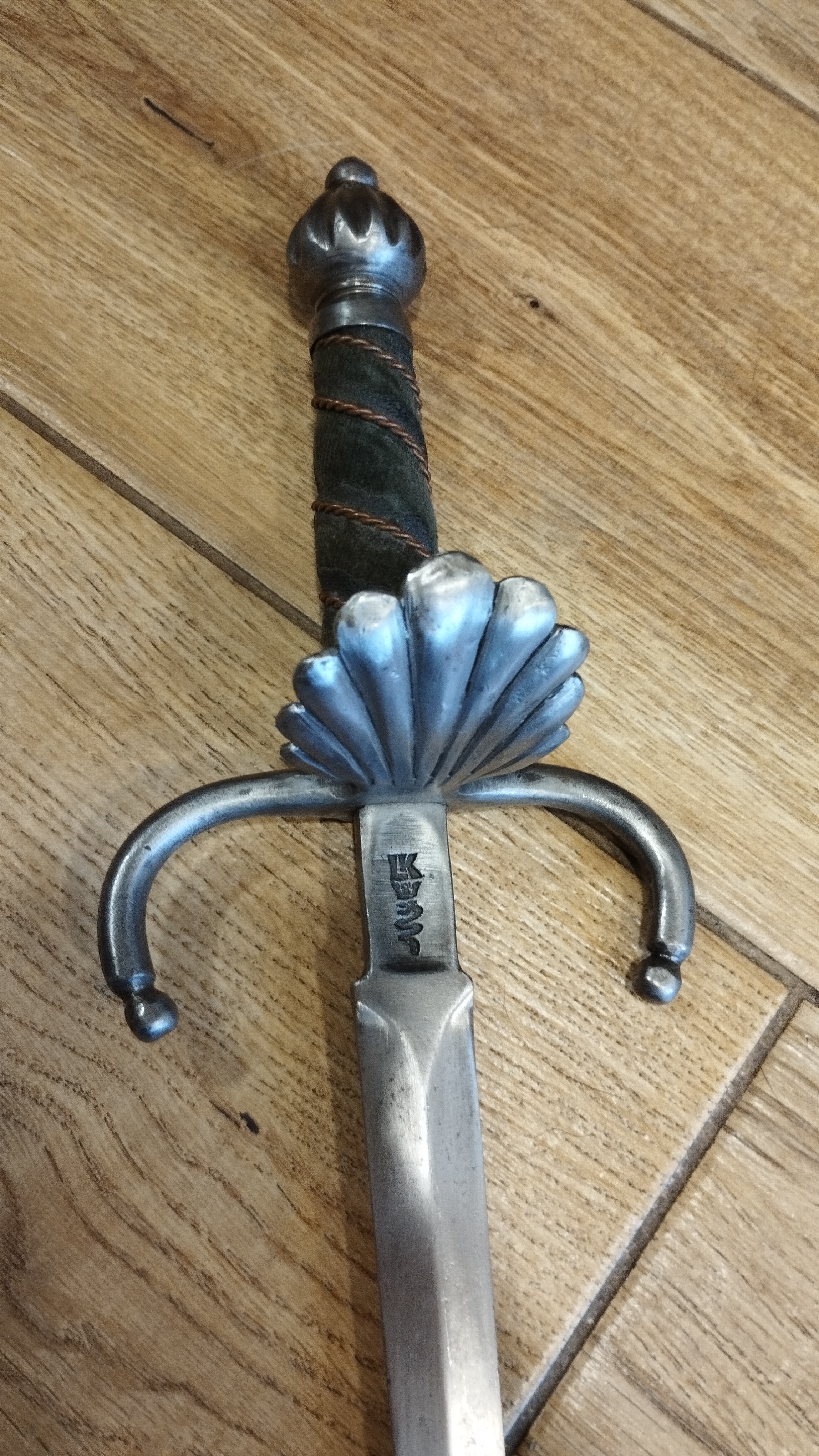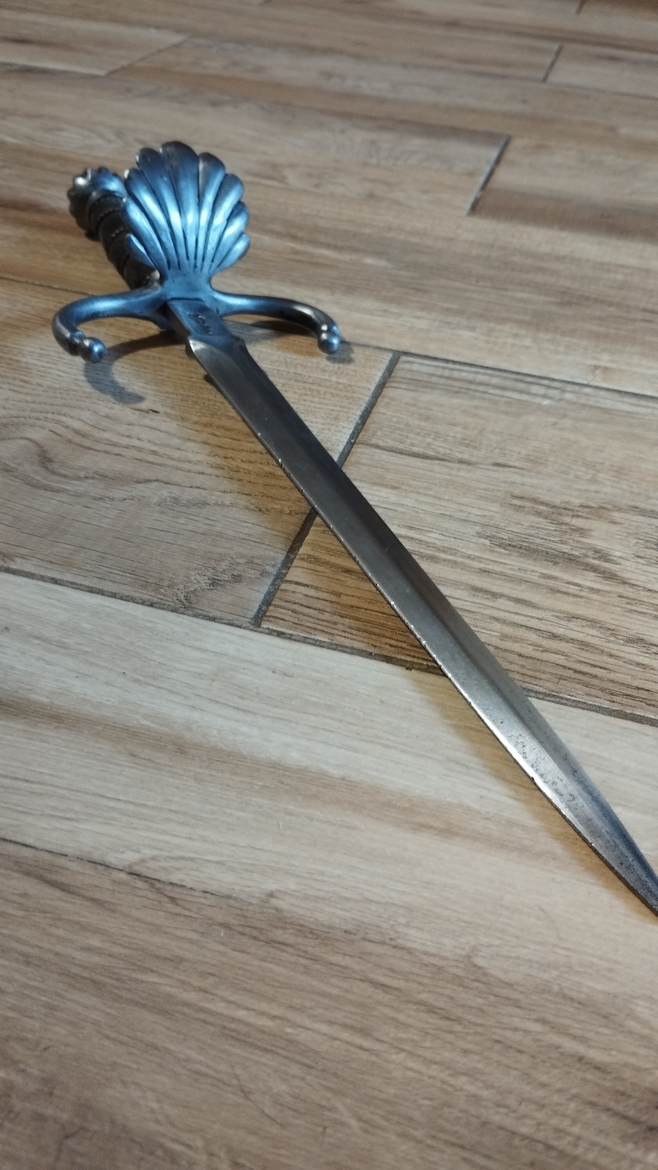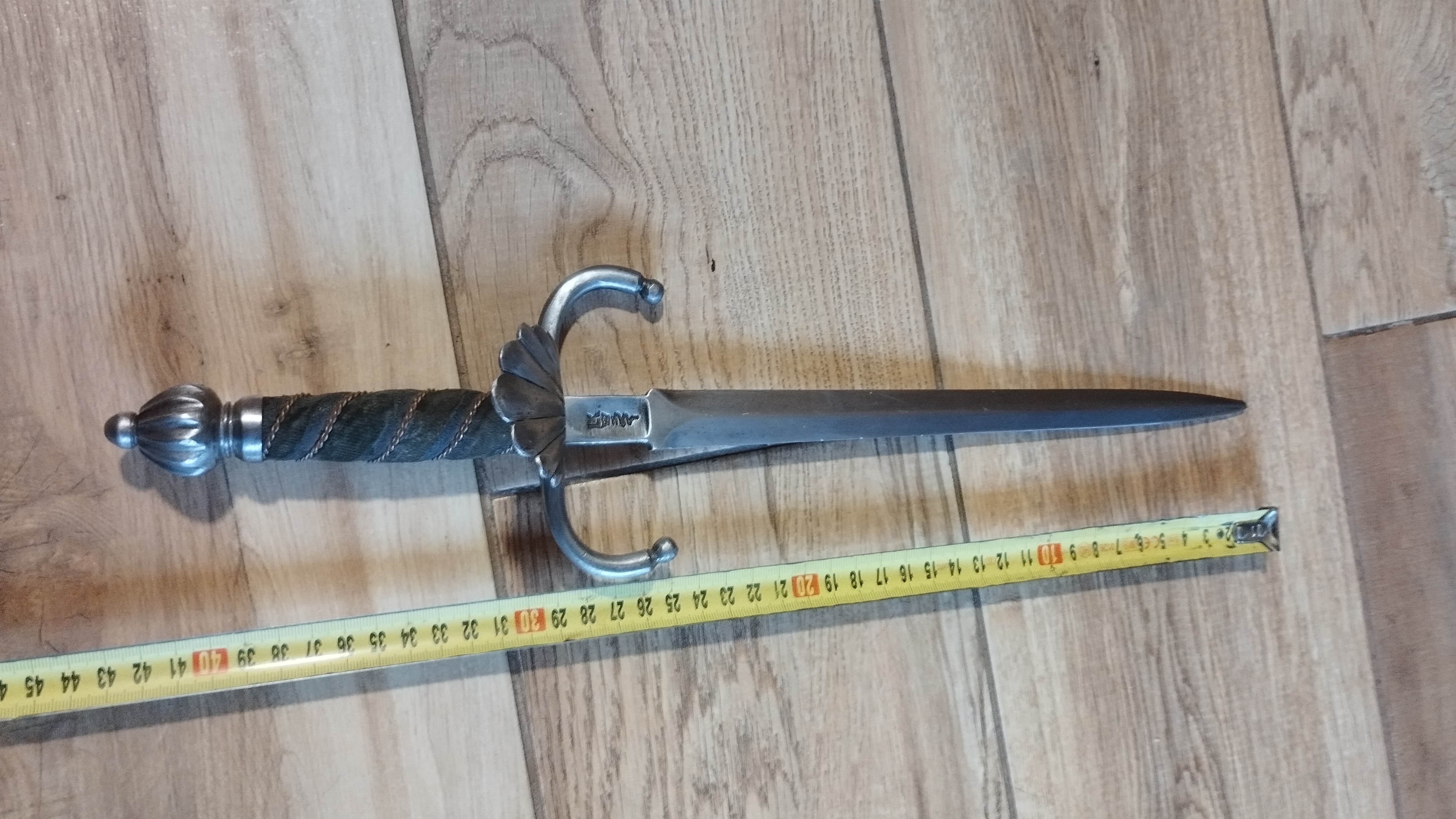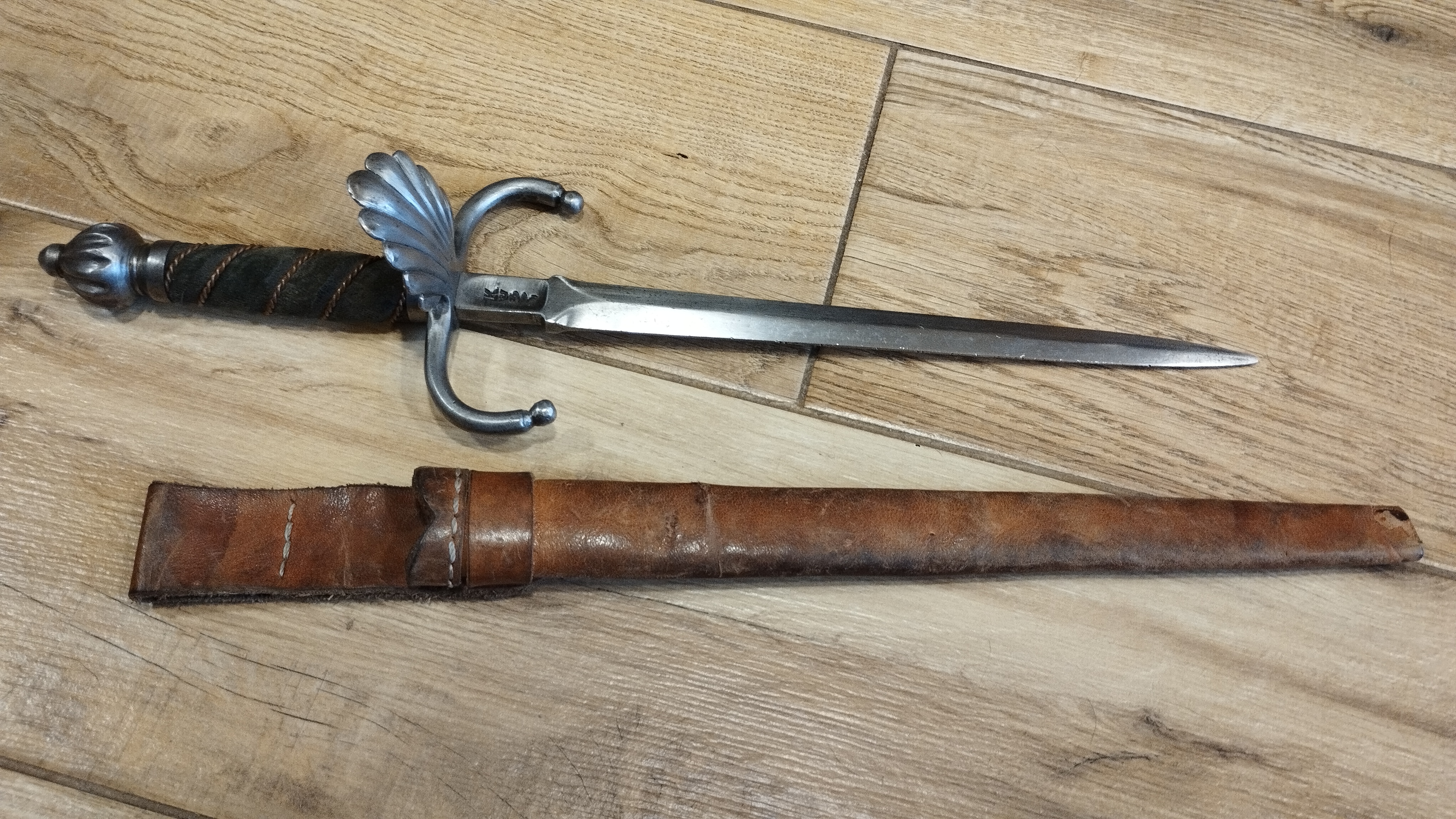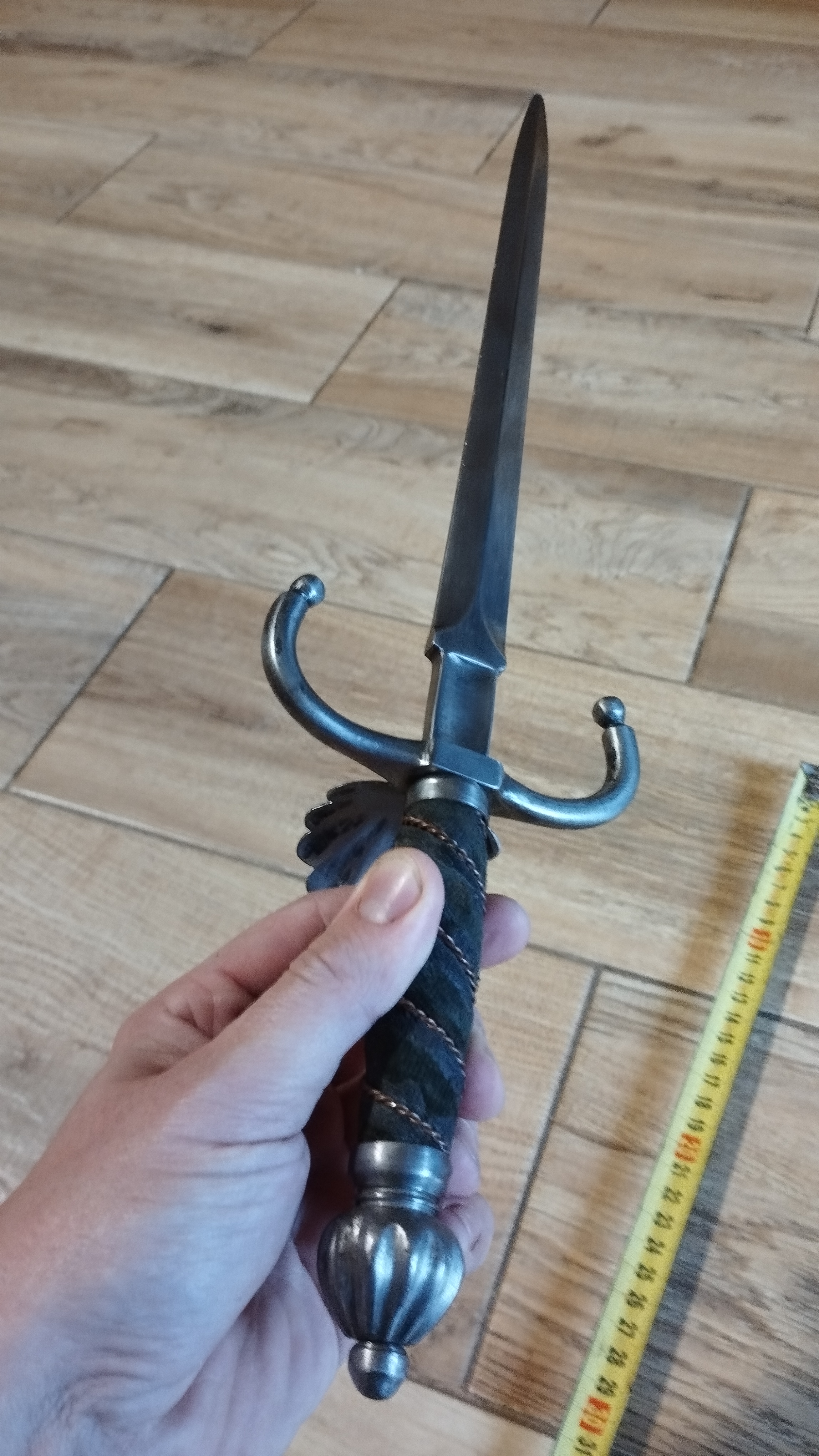 Text inzerátu: Prodám kovanou levoruční dýku na šerm. Výrobce Luděk Kalný. Délka 42,5cm. Váha 435g. Použitá, ale ve skvělém stavu. Kožená pochva v ceně. Cena 4800,- (+ poštovné).