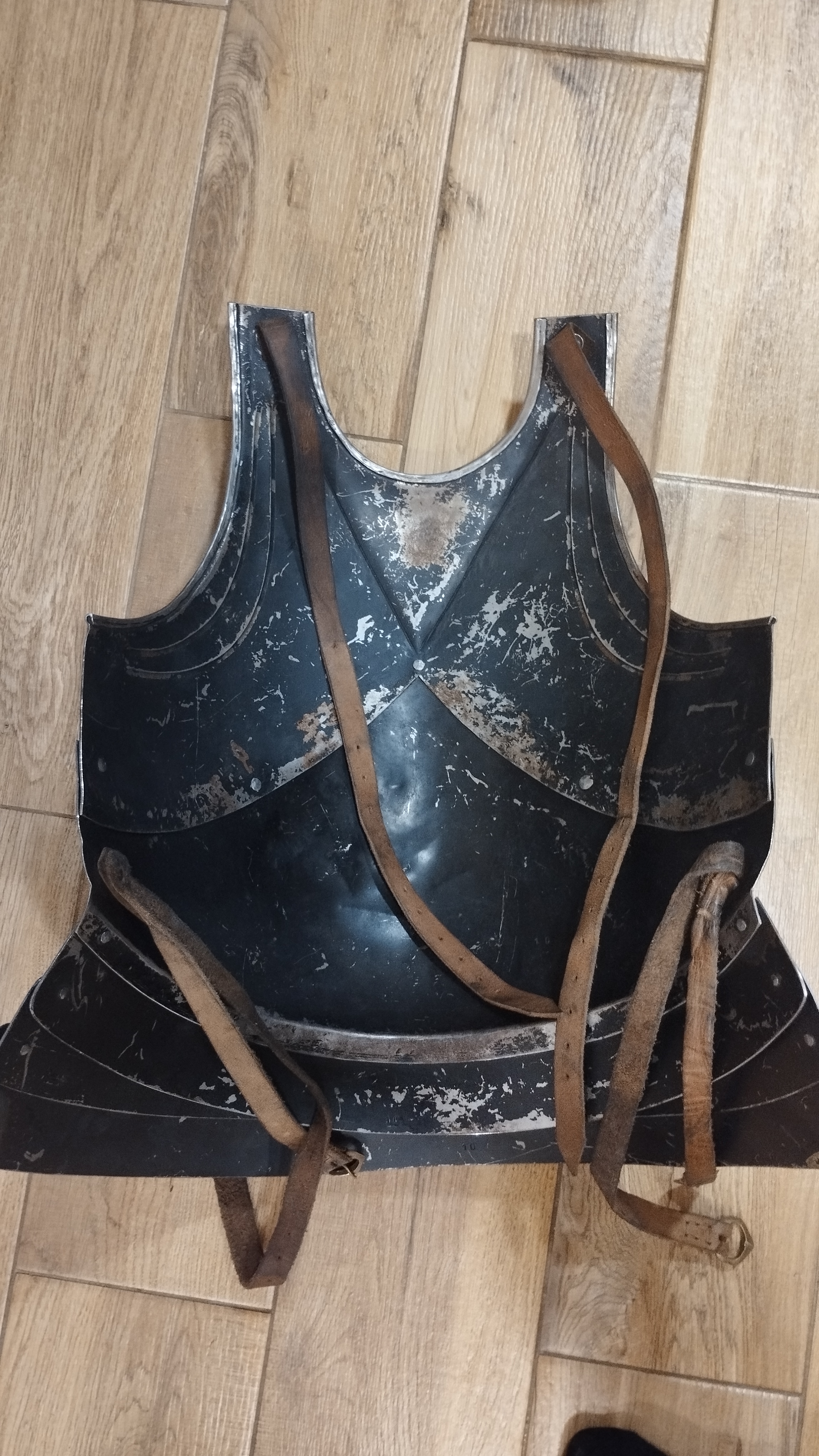 Text inzerátu: Prodám přední kyrys. Síla materiálu 1,6mm, používaný, ale v dobrém stavu (viz foto). Foceno na postavě 185cm, 90kg). Cena 3500,- (+ poštovné).