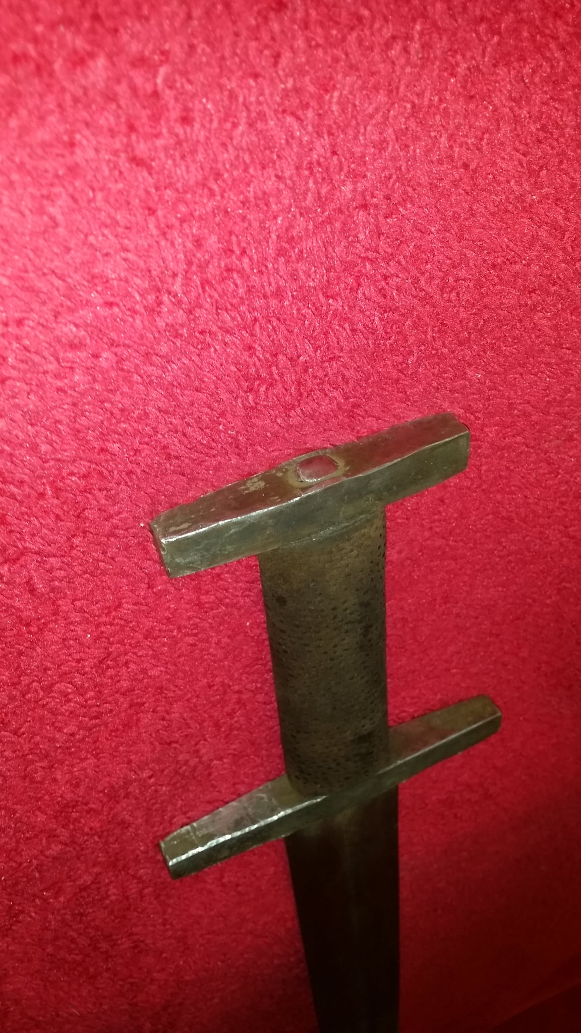 Petersenova typologie M, kovaná záštita a hlavice, jílec dřevěné oválné jádro potažené kůží, čepel bez zubů. Celková délka 77,5 cm, délka čepele 63,5 cm, šířka záštity 12,5 cm, šířka hlavice 8,5 cm, váha +-1100 g.