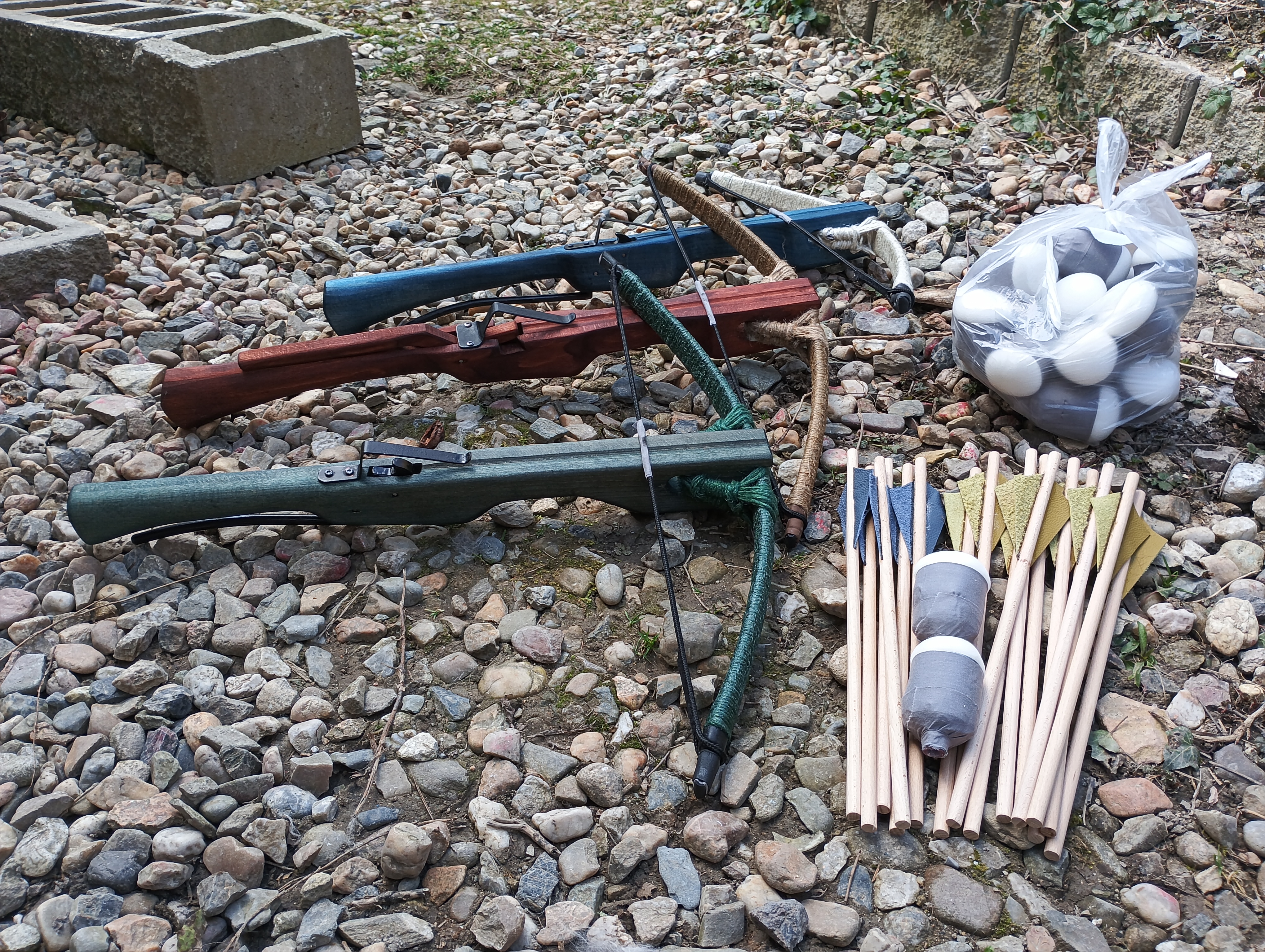 Text inzerátu: Prodám larpové kuše, kus za 3500 jen menší zelená za 3300 , natah kolem 14,5kg, šipky larpove včetně hlavice kus za 90 Kč , více rád zodpovím emailem ...