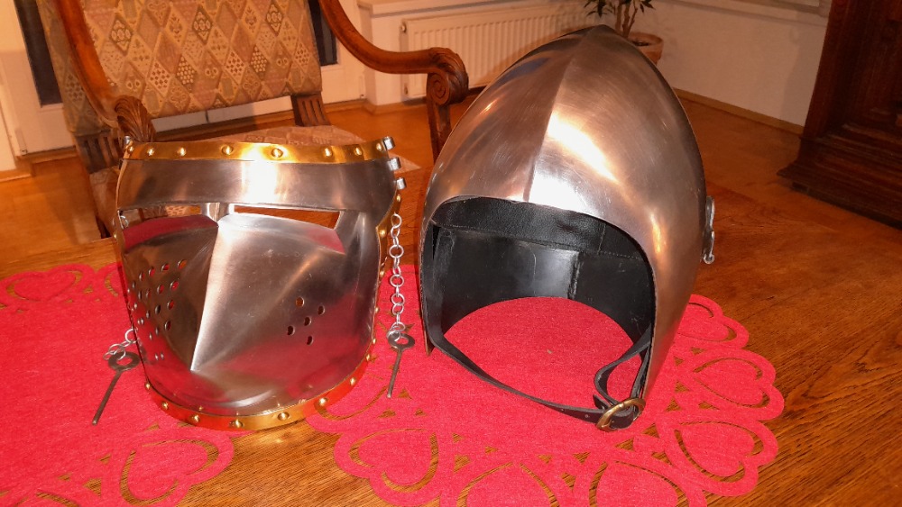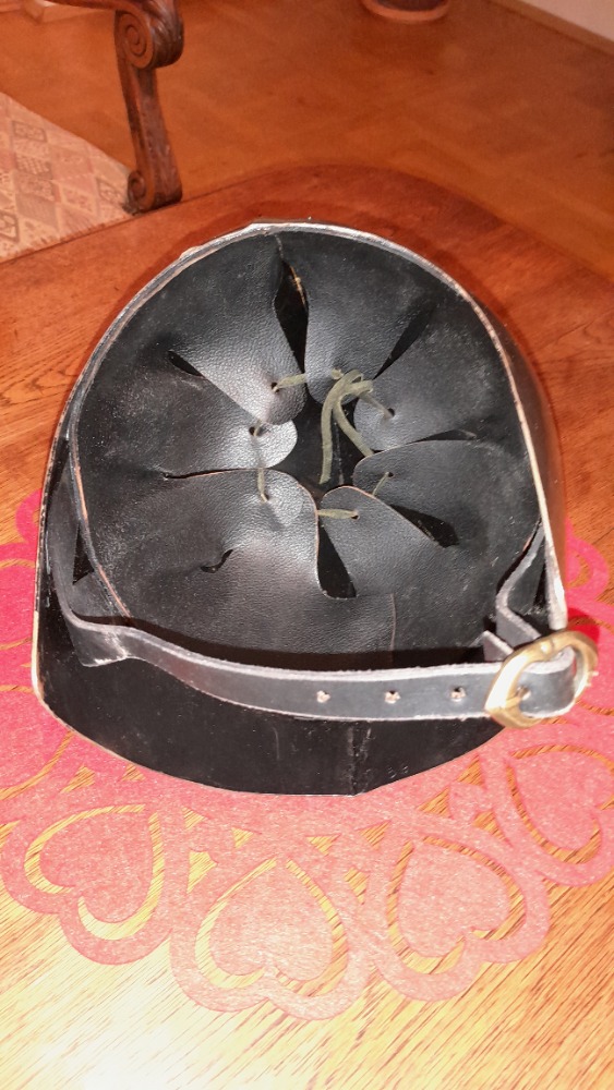 Text inzerátu: Milánský šlap Psí nos s mosazným lemováním. Síla plechu 1,6 mm. Přilba je uvnitř vybavena nastavitelným koženým polstrováním a koženým podbradním řemínkem. Přilba je nová 1 x použitá bez poškození.
