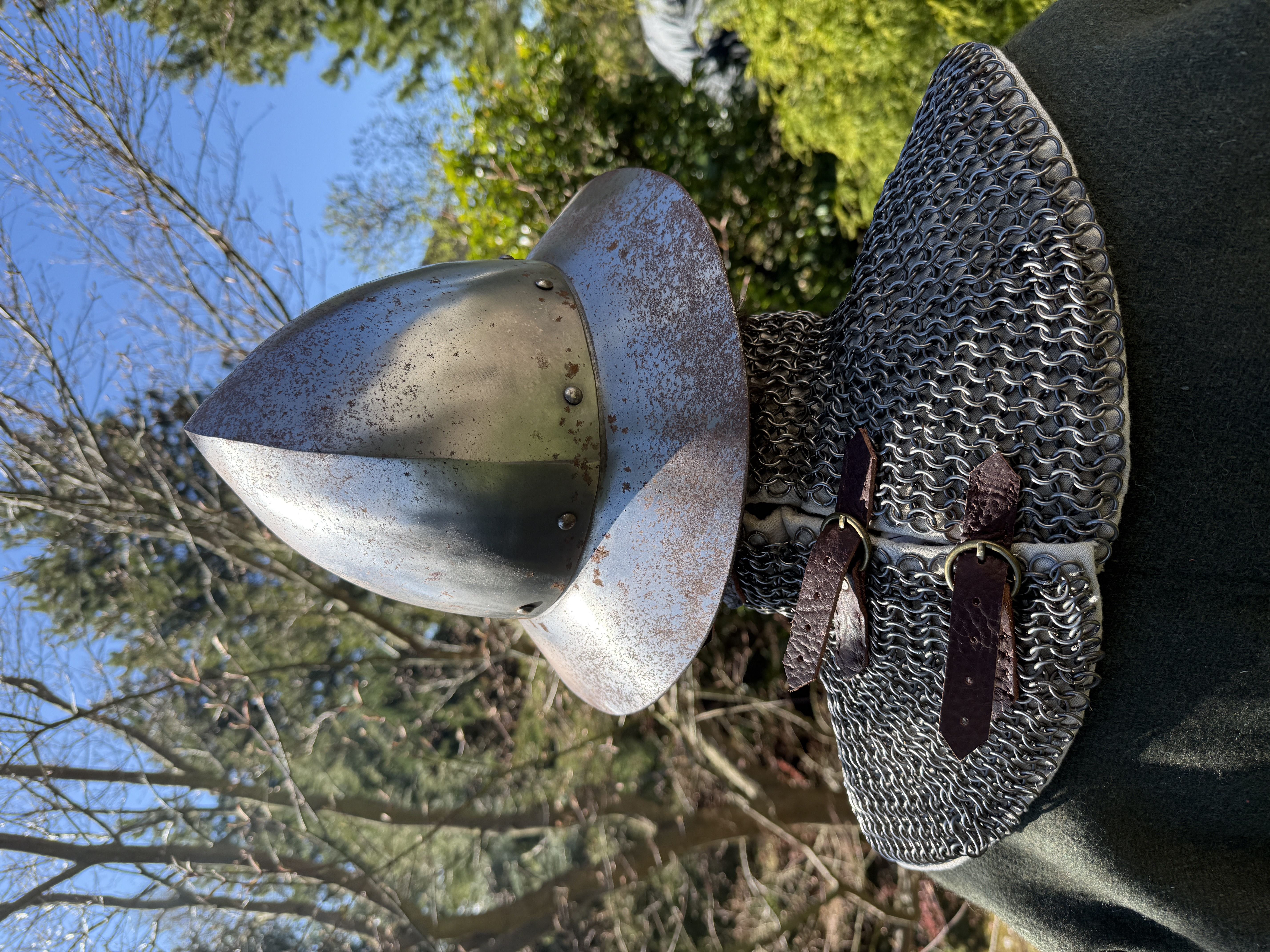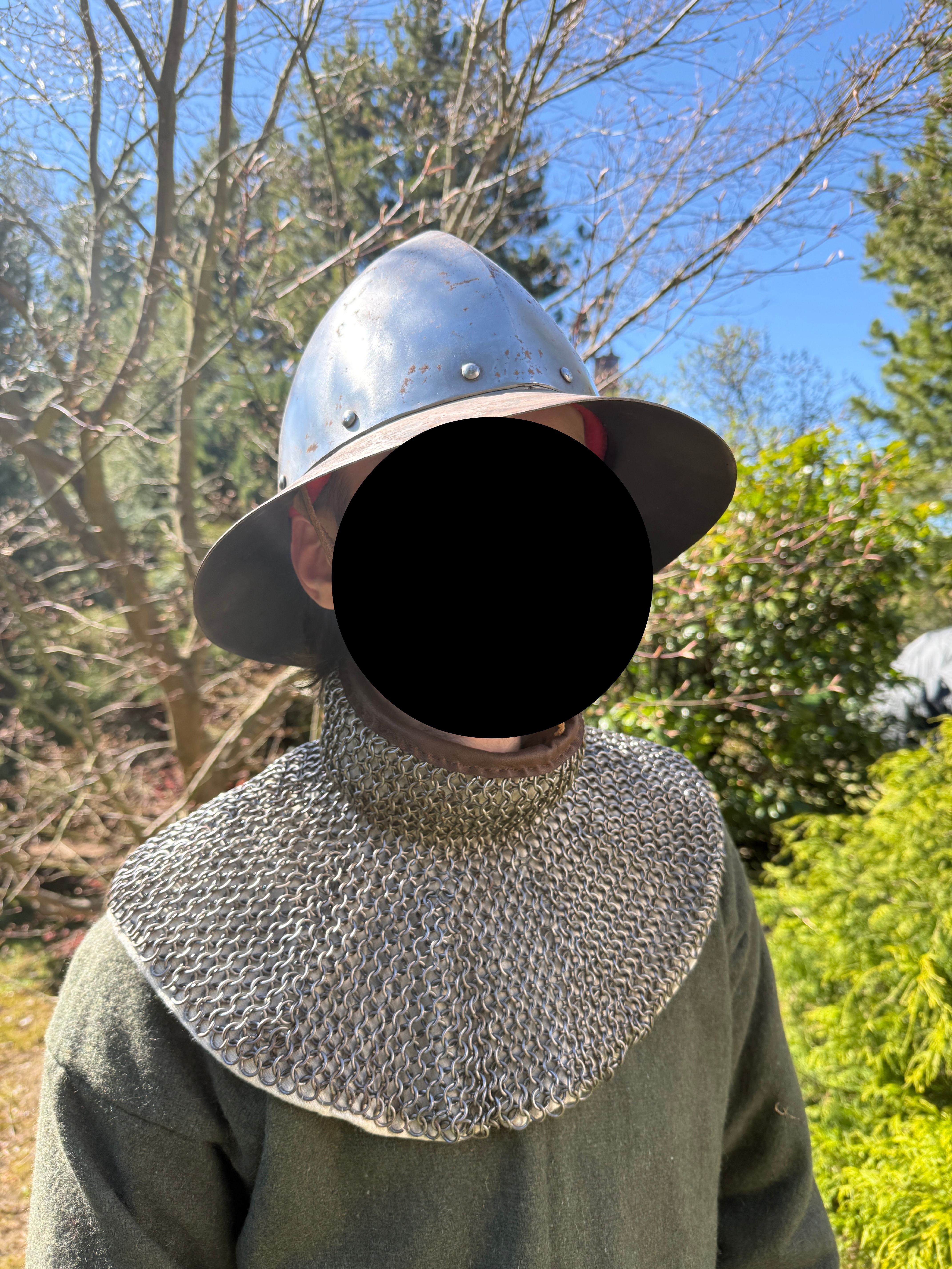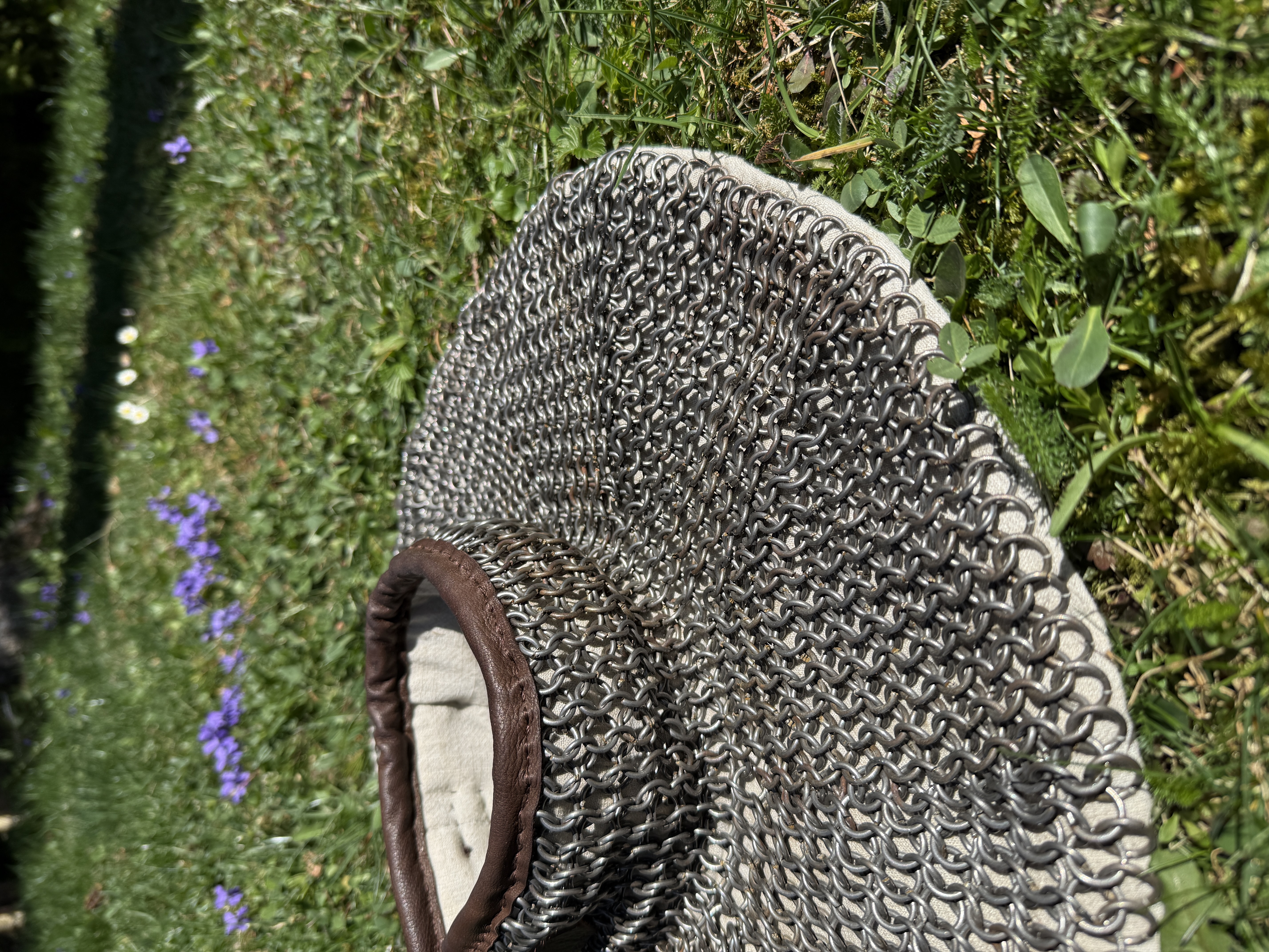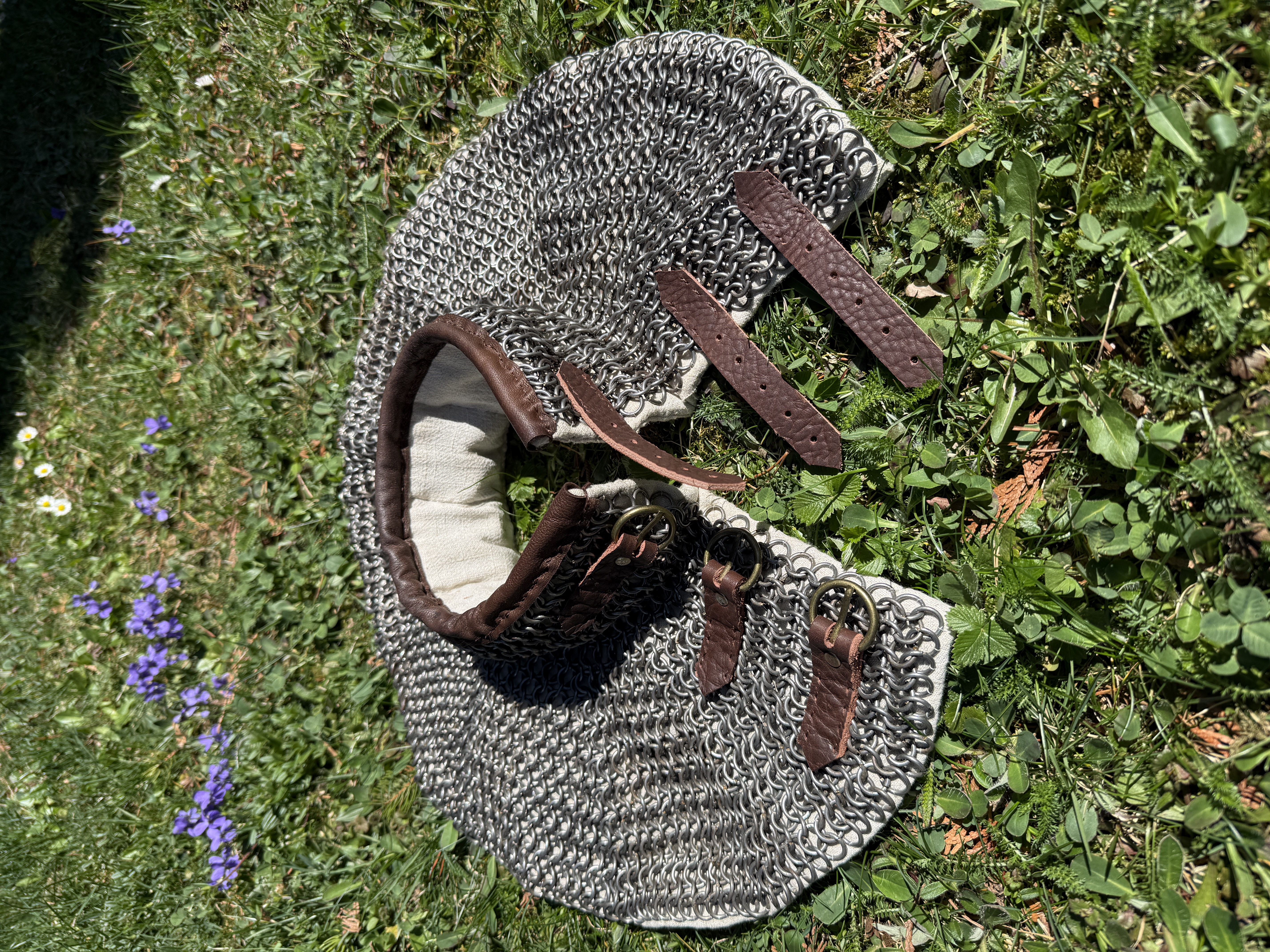 Text inzerátu: Prodám podšitý kroužkový límec. Univerzální velikost, průměr límce cca 40cm, výška krku cca 7cm. Kroužky o průměru 9mm zavírané pozink. Podšité vlněným prošitým límcem obšitým lnem. Límeček obšitý kůží. Zapínání v zadní části na 3 přezky.