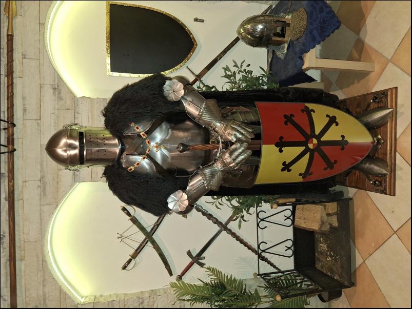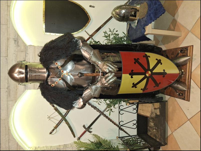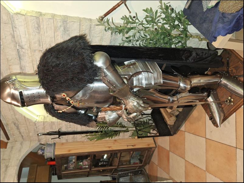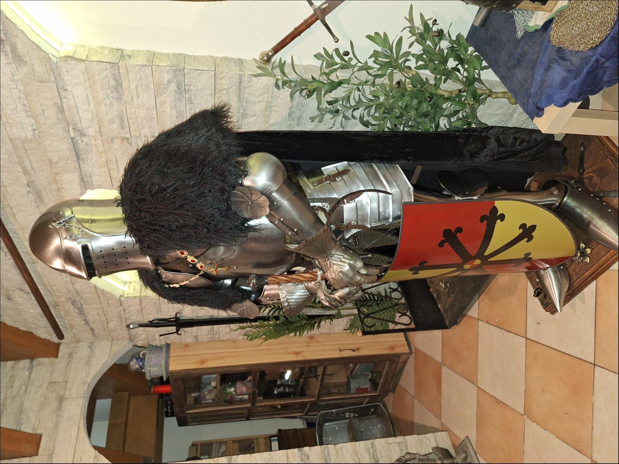 Cena: 50 000 Prodám kompletní Anglickou turnajovou zbroj z erbem hraběte z Essexu,zbroj je nová vhodná jak k dekoraci tak i k šermu na postavu 170 a výše,komplet obsahuje kyrys se šorci, nákrčník, ramena, ruce, zdobené prstové rukavice, celoplátové nohy, boty sabatony, šlap s hledím, starší drátěná košile s krátkým rukávem ale ve skvělém stavu, kovový polohovatelný stojan na dřevěném podstavci který je okován, jedenapul ruční meč kovaný s pérové oceli, kovový ručně malovaný štít, plášť s umělou kožešinou, náhrdelník, opasek | |
