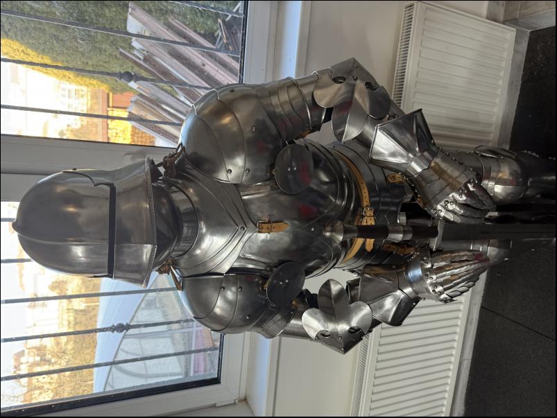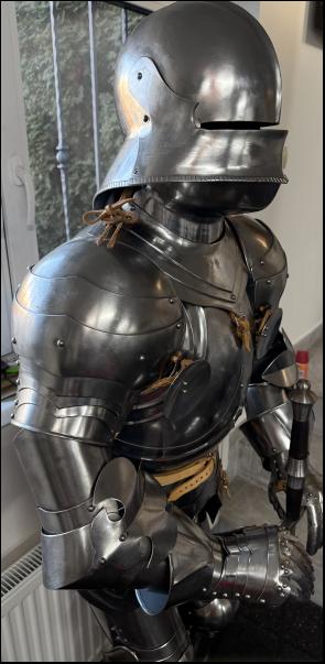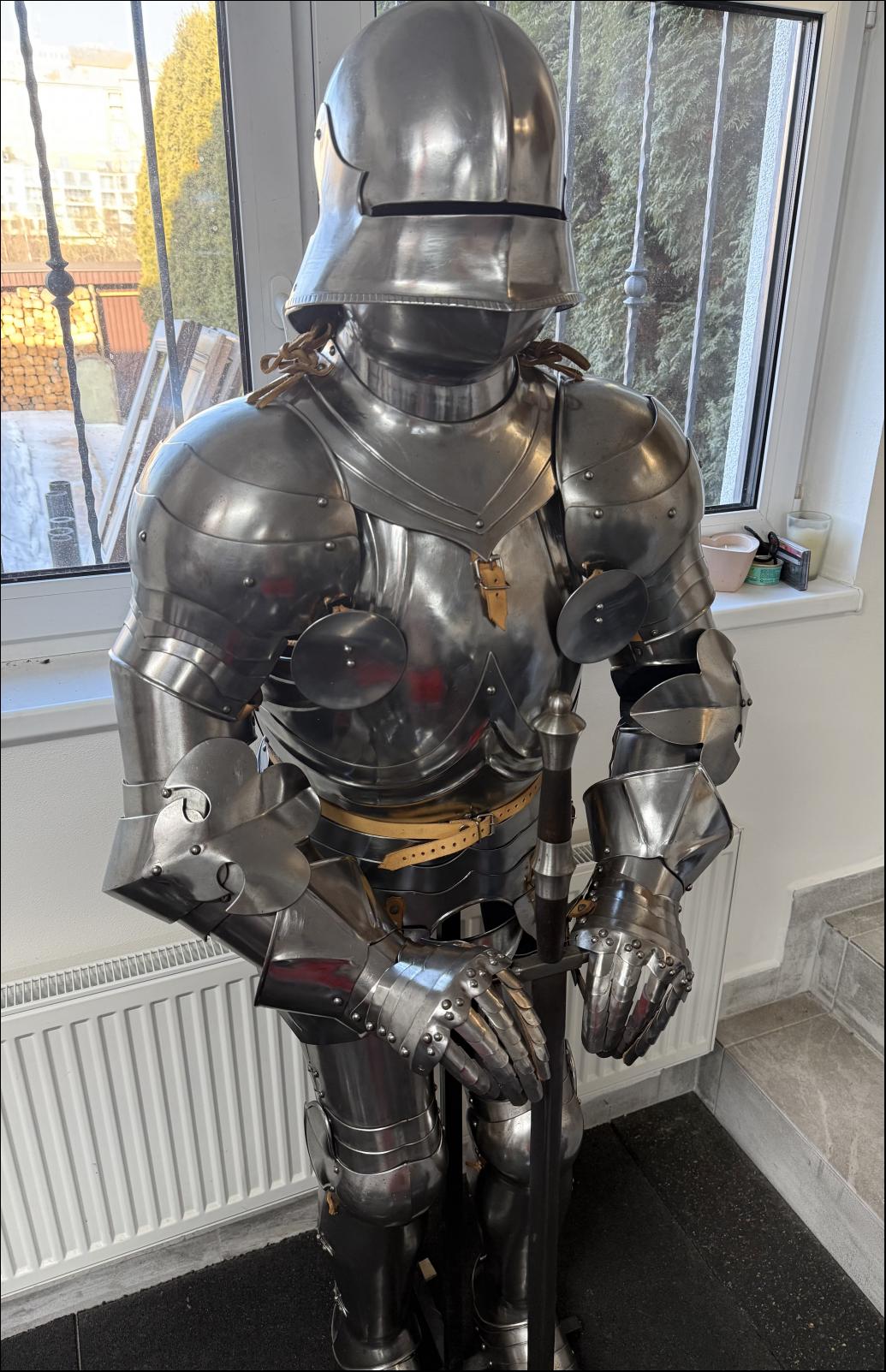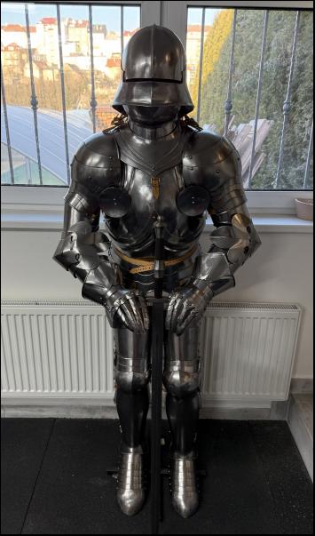 Kompletní zbroj včetně přilby, rukavic, holení i ramen. Součástí je i stojan a na zakázku dělaný jeden a půl ruční meč. Zbroj není jenom dekorace ale je plně použitelná na historicky šerm nebo living history.