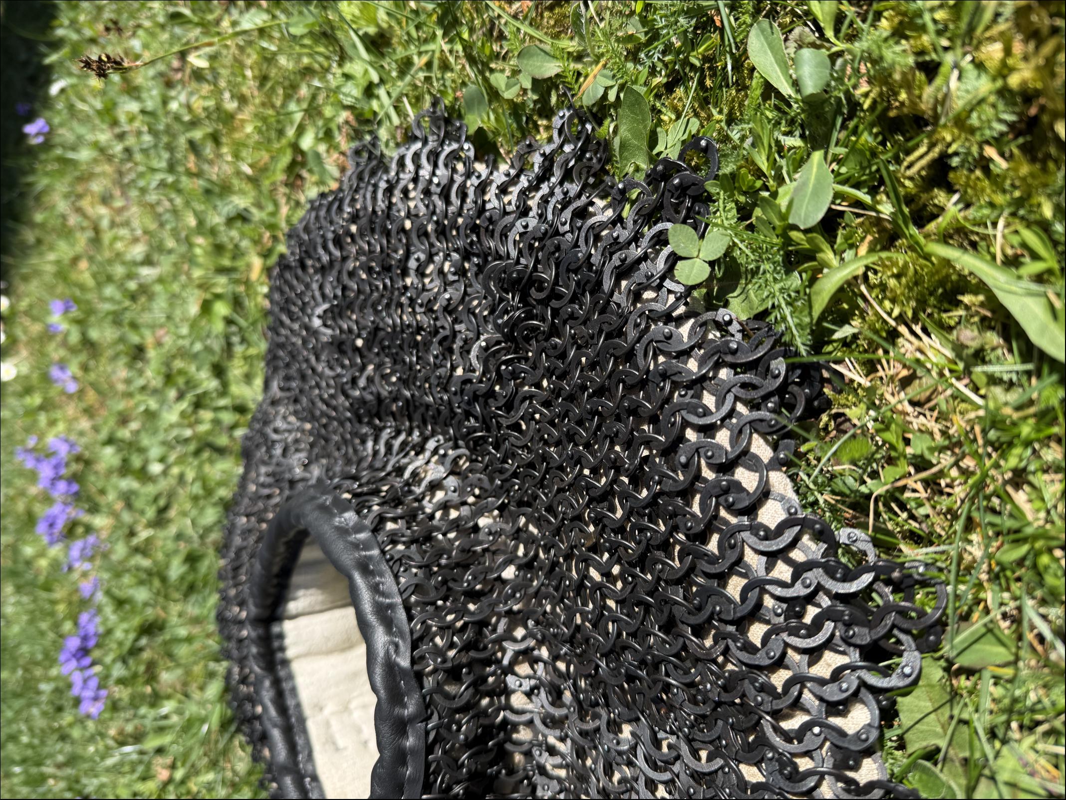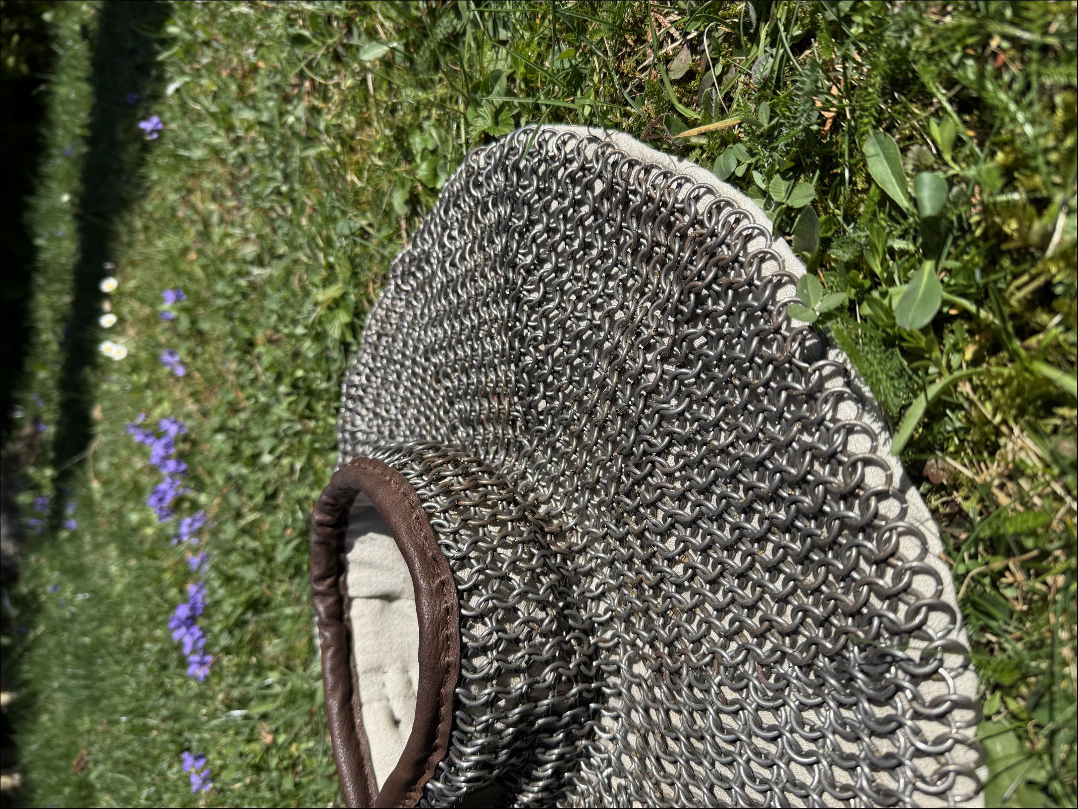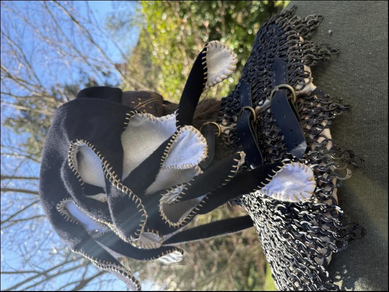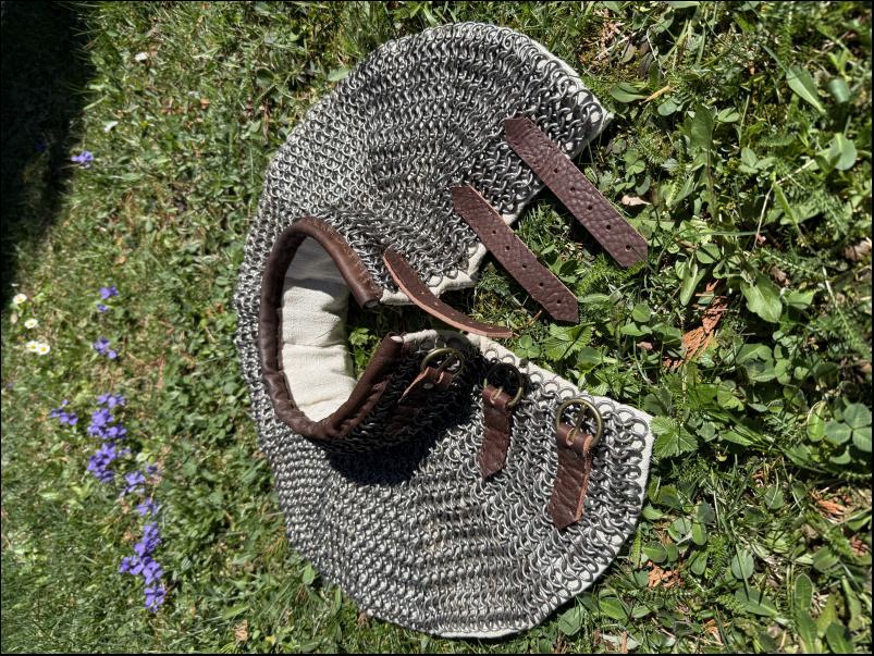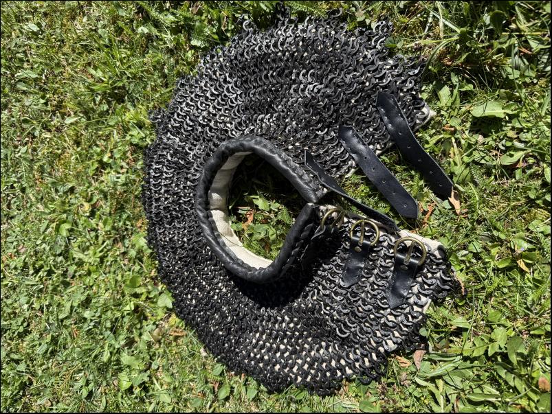 Prodám podšitý kroužkový límec. Univerzální velikost, průměr límce cca 40cm, výška krku cca 7cm. Kroužky o průměru 9mm zavírané pozink. Podšité vlněným prošitým límcem obšitým lnem. Límeček obšitý kůží. Zapínání v zadní části na 3 přezky.