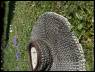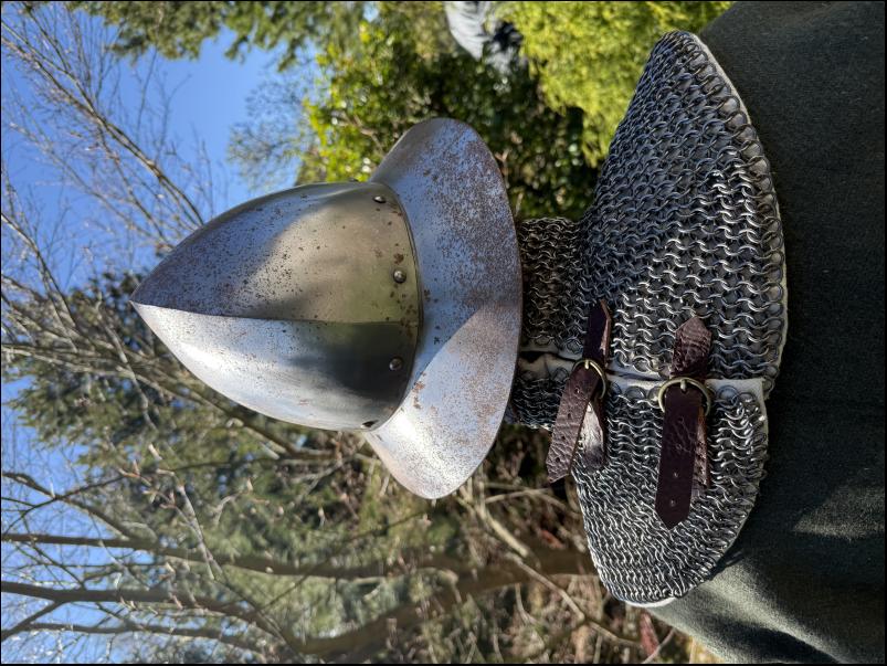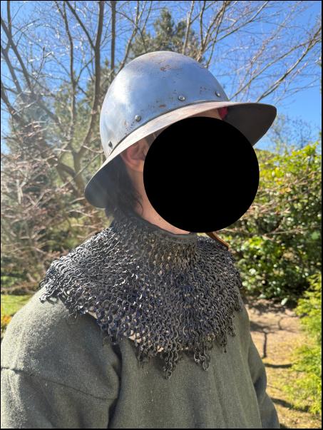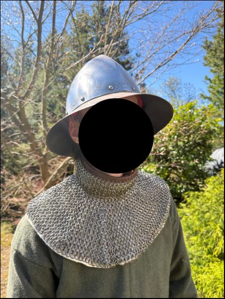Barbuta s odnímatelným hledím bez vnitřního polstrování. Slabší plech (cca 1,2 mm). Střední velikost. Spíše vhodná na LARP. Mírné poškození na temeni (viz foto).
